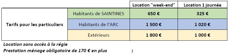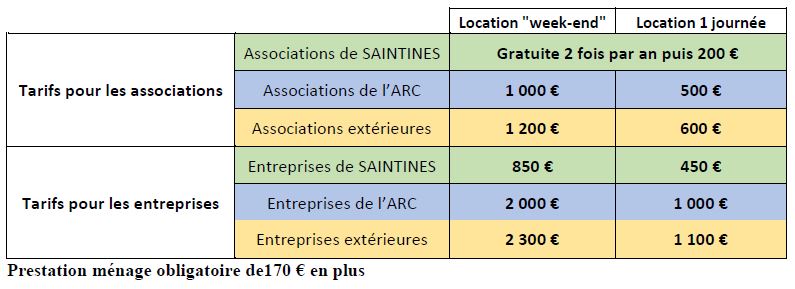 Les tarifs de location sont fixés par délibération du Conseil Municipal (MJ 08/12/2026)
